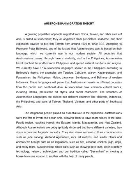 - Cultural Diversity: The migration led to the spread of Austronesian languages and cultures, contributing to the rich cultural diversity of Southeast Asia and the Pacific. The spread of Austronesian languages and cultures played a significant role in shaping the cultural diversity of Southeast Asia and the Pacific. As the Austronesians migrated, they interacted with indigenous populations, exchanging ideas, technologies, and cultural practices. This process of cultural exchange led to the emergence of hybrid cultures that blended Austronesian and indigenous elements.