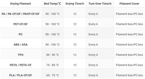 Drying Recommendations for Different Filament Types