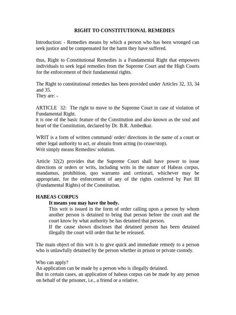 Constitutional remedies are the backbone of a just and fair society. They ensure that the fundamental rights guaranteed by the constitution are not just empty promises but are actually enforceable. Without these remedies, our rights would be meaningless, and the government could act with impunity. These remedies empower us to stand up for our rights and hold the government accountable. They are essential for preserving democracy and protecting individual liberties.