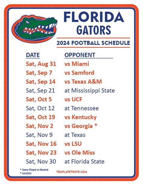 Alright, guys, let’s get straight to it! The 2024 Florida Gators football schedule is packed with exciting games. This season promises a mix of familiar rivals and fresh challenges, so buckle up. To ensure you have all the key dates, we’ve compiled everything you need to know. We will break down each game, its date, and opponent, so you can start planning your game-day experiences. You can find the PDF version as well to print out and stick on your fridge. This is your comprehensive guide to the Gators’ upcoming season. The complete schedule is listed below, with details you won’t want to miss. Prepare to see the Gators battle it out on the gridiron! Remember to keep checking back for any updates or changes. Now, let’s get into the specifics. Each game is a chance to show our Gator spirit and support our team. Make sure you don’t miss a single moment of the action. The anticipation is building, and we are ready to cheer on our Gators to victory! Let’s go Gators !