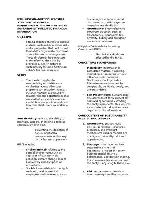 Alright, let’s break down the objective and scope of IFRS S1 . The main objective is to require companies to disclose information about their sustainability-related risks and opportunities. This will enable investors to assess the company’s enterprise value. Simply put, IFRS S1 wants companies to be transparent about how they’re handling sustainability issues that could affect their financial performance. The scope of IFRS S1 is broad. It applies to all companies that report under IFRS Accounting Standards, and it covers all sustainability-related risks and opportunities that could reasonably be expected to affect the company’s cash flows, access to finance, and overall financial position over the short, medium, and long term. This means it’s not just about environmental issues; it’s also about social and governance aspects. Think about things like climate change, human rights, labor practices, and board diversity – all of these fall under the scope of IFRS S1 if they have the potential to impact the company financially. IFRS S1 aims to provide a comprehensive view of a company’s sustainability profile. This information is intended to be used by investors and other stakeholders. It is also designed to be useful in evaluating a company’s long-term value and its ability to create and preserve value over time. By providing a clear and consistent framework for sustainability disclosures, IFRS S1 helps to reduce information asymmetry between companies and investors, leading to more informed investment decisions and more efficient capital allocation. Furthermore, the scope includes an assessment of a company’s climate-related risks, specifically aligning with the recommendations of the Task Force on Climate-related Financial Disclosures (TCFD). This alignment ensures that the disclosures are relevant and useful for investors who are increasingly focused on climate change risks and opportunities. The goal is to provide a holistic and comparable view of a company’s approach to sustainability. This is so that investors can make informed decisions based on consistent, reliable, and relevant information.