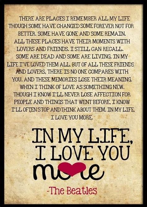 But of all these friends and lovers There is no one compares with you And these memories lose their meaning When I think of love as new Though I know I’ll never lose affection For people and things that went before I know I often stop and think of them In my life, I love you more