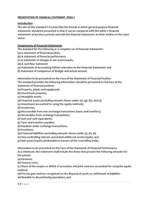 Now, let’s dive into the nitty-gritty – the key components that make up IPSAS No. 1 of 2017 . Understanding these building blocks is crucial for anyone tasked with preparing or analyzing public sector financial statements. First off, the standard emphasizes the overall objective of financial statements . It states that financial statements are intended to provide information about the financial position, performance, and cash flows of an entity that is useful to a wide range of users in making and evaluating decisions about the allocation of resources. This is the ‘why’ behind everything. Think about it: without this clear objective, financial statements could just be a jumble of numbers with no real purpose. The standard also sets out general principles that guide the preparation of these statements. These include concepts like the accrual basis of accounting , which means transactions are recognized when they occur, regardless of when cash is exchanged. This gives a much more accurate picture of an entity’s financial activities over a period. Then there’s the going concern assumption , which assumes the entity will continue to operate in the foreseeable future. This is vital for understanding the long-term viability of public sector operations. Fair presentation is another cornerstone. Financial statements must faithfully represent the transactions and other events of an entity. This means being neutral, complete, and free from material error. We also need to talk about compliance with IPSAS . The standard explicitly requires that financial statements must state that they have been prepared in accordance with IPSAS. This is where the integrity of the whole system comes into play. Moving on, structure and content are heavily detailed. IPSAS No. 1 specifies the minimum requirements for the structure of financial statements, including the Statement of Financial Position , the Statement of Financial Performance , the Statement of Changes in Net Assets/Equity , and the Statement of Cash Flows . It also provides guidance on the Statement of Comparison of Budget and Actual Amounts , which is a really important addition for public sector accountability. The standard also touches upon notes to the financial statements . These are crucial for providing additional information that is not presented in the main body of the statements but is essential for a fair presentation. This can include details on accounting policies, significant judgments, and the nature and amount of uncertainties. Finally, the standard addresses comparative information , meaning that information for prior periods should be presented. This allows users to track trends and make comparisons over time, which is absolutely vital for performance evaluation. So, as you can see, IPSAS No. 1 of 2017 isn’t just a brief overview; it’s a comprehensive framework that lays down the fundamental rules for preparing clear, consistent, and trustworthy financial reports in the public sector. It’s all about making sure that the money entrusted to public entities is accounted for properly and that the results are communicated effectively to everyone who needs to know. Pretty essential stuff, right? Keep these components in mind as we move forward!