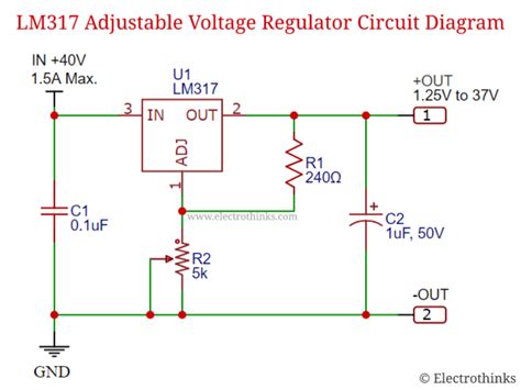 3. Resistor Network (Voltage Divider): Connect resistor R1 (typically around 240 ohms) between the Output pin (OUT) and the Adjust pin (ADJ). Connect resistor R2 between the Adjust pin (ADJ) and Ground (GND).