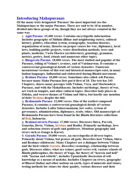 Okay, guys, so there are specifically eighteen Mahapuranas . It’s like a collection of the greatest hits of ancient Hindu literature! Each one is a treasure trove, focusing on different deities and aspects of the divine. Let’s take a quick peek at some of the most well-known ones and what they’re generally about. Remember, these are just brief highlights, as each Purana is incredibly vast and complex. We’re talking about immense bodies of knowledge, folks!