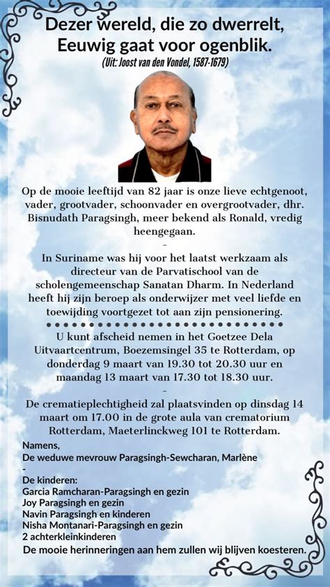 Het is nooit makkelijk om afscheid te nemen van een dierbare, en in tijden van rouw kan het vinden van de juiste informatie een extra last zijn. Voor wie vandaag op zoek is naar overlijdensberichten in Suriname , bieden wij een overzicht en gids om u te helpen bij het vinden van de nodige details. Of u nu een bericht wilt condoleren, informatie zoekt over een uitvaart, of simpelweg op de hoogte wilt blijven van recente overlijdensgevallen, deze gids is er om u te ondersteunen. We duiken dieper in de verschillende manieren waarop u deze berichten kunt vinden, welke informatie u kunt verwachten, en hoe u het proces van het delen van medeleven kunt benaderen. We begrijpen dat dit een gevoelige periode is, en ons doel is om dit proces zo soepel en respectvol mogelijk te maken voor iedereen die hiermee te maken heeft. Laten we samen bekijken hoe u de meest actuele en relevante overlijdensberichten in Suriname kunt vinden, zodat u uw steun kunt betuigen en de herinnering aan de overledene kunt eren. Het delen van verdriet en het samenbrengen van gemeenschappen in moeilijke tijden is cruciaal, en informatie over overlijdensberichten speelt hierin een belangrijke rol. We zullen ook ingaan op de culturele aspecten die gepaard gaan met overlijdensberichten in Suriname, wat kan variëren afhankelijk van de etnische achtergrond en religieuze overtuigingen van de overledene en de familie.