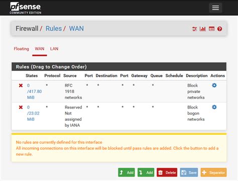First things first, let’s get logged into your pfSense web interface. Open up your favorite browser and type in your pfSense firewall’s IP address. If you haven’t changed it, the default is usually 192.168.1.1 . Once you’re there, punch in your username and password – hopefully, you’ve already changed the default credentials for security reasons! Once you’re in, look for the “Firewall” option in the navigation menu. Hover over it, and you’ll see a dropdown. Click on “Rules” . This takes you to the main firewall rules page where all the magic happens. Now, this page will likely look different depending on how much you’ve already configured. You’ll see a list of interfaces (like LAN, WAN, etc.) each with its own set of rules. These interfaces represent different network connections that your pfSense firewall manages. Taking the time to familiarize yourself with this interface is essential for effectively managing your network’s security. Each interface has its own table of rules, allowing you to specify different policies for different network segments. Before making any changes, it is a good idea to back up your current configuration. This allows you to easily revert to a known working state if something goes wrong. The pfSense web interface provides a straightforward way to download your configuration file, ensuring that you can quickly recover from any mistakes or unexpected issues. Remember, a well-managed firewall is a cornerstone of network security, so taking the time to understand and properly configure your pfSense firewall is a worthwhile investment.