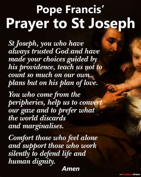 Alright guys, let’s get down to the nitty-gritty: the prayer itself . When Pope Francis shares a prayer, especially one dedicated to St. Joseph , it’s usually more than just a request; it’s often a call to action and a plea for protection. The prayers he’s encouraged us to use often encapsulate his deep understanding of St. Joseph’s virtues and his role in our lives. Think about the core themes: protection, guidance, and spiritual fatherhood . These aren’t just abstract concepts; they’re vital needs for us navigating this crazy world. St. Joseph, as the protector of the Holy Family, is naturally invoked as a guardian for our own families and for the Church. Pope Francis frequently highlights Joseph’s role as a model father , not just biologically, but as a spiritual father figure who nurtures, protects, and guides. The prayer often asks for Joseph’s intercession in our daily struggles, whether it be at work, in our families, or in our personal faith journey. It’s a recognition that St. Joseph, having lived a life of humble service and trust, understands the challenges we face. For instance, a common theme is asking Joseph to help us be diligent in our work and loving in our families . He’s the patron of workers, so asking him for help with employment, vocational discernment, or just the strength to do our jobs with integrity makes perfect sense. His quiet strength and perseverance are qualities we often pray for ourselves and our loved ones. The prayer also invokes his role as a protector against evil . In a world filled with temptations and dangers, both spiritual and material, we turn to St. Joseph, the one who safeguarded Jesus, to shield us from harm. This isn’t about magical thinking; it’s about asking for the intercession of a saint who lived a life of virtue and obedience, and whose prayers are believed to be powerful before God. Pope Francis often encourages us to pray for the Church , asking St. Joseph to protect the Pope, bishops, priests, and all the faithful. He sees Joseph as a vital guardian for the Bride of Christ, especially during difficult times. The prayer often includes a petition for purity of heart and chastity , reflecting Joseph’s own virtuous life as Mary’s spouse. It’s a call for us to strive for holiness in our own relationships and personal lives. Essentially, the prayer is a practical tool for spiritual growth. It’s not just a passive recitation but an active engagement with St. Joseph’s virtues and his powerful intercession. By praying these words, we are invited to imitate Joseph’s faith , his obedience , his humility , and his love . Pope Francis wants us to see St. Joseph not just as a historical figure but as a living saint who can actively help us in our daily lives. The prayer serves as a concrete way to foster this relationship and to ask for his powerful assistance in becoming better Christians, better workers, and better family members. It’s a profound expression of trust in God’s providence, channeled through the intercession of His most faithful servant.