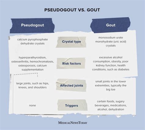 - Treatment: Gout treatment focuses on lowering uric acid levels, while pseudogout treatment focuses on managing pain and inflammation.