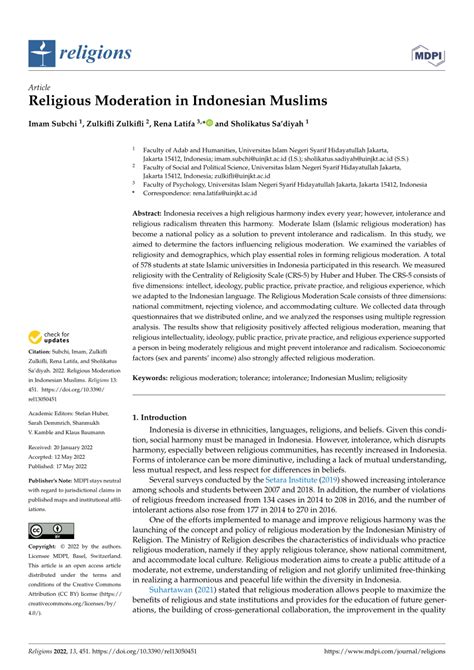 Religious moderation in Indonesia is characterized by a number of important factors that contribute to its unique approach. Religious moderation in the Indonesian context emphasizes finding a middle ground and avoiding extremism in religious practices and beliefs. It involves promoting tolerance, mutual respect, and peaceful coexistence among different religious communities. Indonesia, with its diverse religious landscape, has long embraced the concept of religious moderation as a means to maintain social harmony and national unity. The key characteristics of religious moderation in Indonesia include a focus on inclusivity, dialogue, and collaboration among religious leaders and followers. This approach seeks to bridge divides and foster understanding, rather than promoting division and conflict. One of the primary goals of religious moderation in Indonesia is to prevent the spread of radical ideologies and extremist movements that threaten the country’s pluralistic society. By encouraging moderate interpretations of religious teachings and promoting a culture of tolerance, Indonesia aims to safeguard its social fabric and uphold its national values.