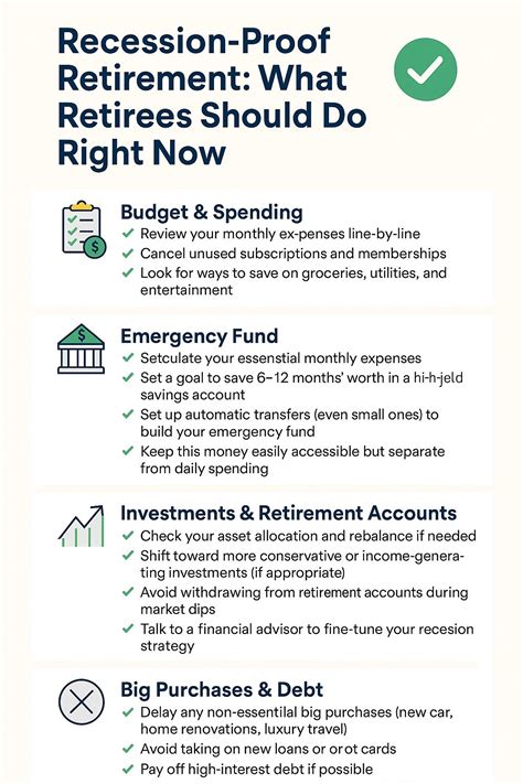 First off, guys, let’s get real about what a recession actually means for retirees. When the economy takes a nosedive, it’s not just about stocks losing value. It can affect your income, the cost of living, and even your peace of mind. Retirees are particularly vulnerable because, well, you’re no longer earning a regular paycheck. Your income is often derived from investments, pensions, and Social Security, all of which can be impacted. For example, if your portfolio is heavily invested in the stock market, a significant downturn means your investment returns might shrink, potentially faster than you anticipated. This is why diversification is your best friend . It’s not just a buzzword; it’s a crucial strategy to spread your risk across different asset classes like bonds, real estate, and even some more stable, income-generating investments. Think about it: if one part of your investment pie is shrinking, other parts might be holding steady or even growing. We’re talking about making sure your money is working smart for you, not just hard . This also ties into having a solid emergency fund. While you might think an emergency fund is just for younger folks, it’s arguably more critical in retirement. Having 6-12 months (or even more!) of living expenses readily accessible in a safe, liquid account can be a lifesaver. It means you won’t be forced to sell investments at a loss during a market downturn just to cover unexpected bills. Consider it your financial shock absorber. Moreover, you need to be proactive about your spending. During a recession, every dollar counts. Reviewing your budget ruthlessly is a must. Identify non-essential expenses that can be trimmed or eliminated. This isn’t about deprivation; it’s about making conscious choices to protect your financial future. Maybe that daily fancy coffee can become a weekend treat, or perhaps you can find more affordable alternatives for entertainment. The goal is to create a spending plan that’s resilient, flexible, and aligned with your priorities. And don’t forget about inflation! Recessions can sometimes be accompanied by rising prices. This means your fixed income might not stretch as far as it used to. Keeping an eye on inflation trends and adjusting your budget accordingly is a vital part of recession preparedness. So, understanding these potential impacts – from investment volatility to cost of living increases – is the first step in building a robust strategy to keep your retirement secure and enjoyable.