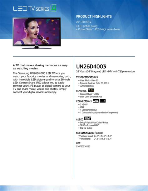 Let’s get into the nitty-gritty of what makes the Samsung UA26D4003 shine. Beyond the stunning visuals, this TV is packed with features designed to enhance your viewing pleasure. First up, we have ConnectShare Movie . This is a total lifesaver, guys! It allows you to plug in a USB drive and instantly enjoy movies, music, or photos right on your TV screen. Forget messy cables or complicated setups; just plug and play. It’s perfect for sharing vacation photos with the family or watching downloaded movies without needing another device. Then there’s the SRS TheaterSound . This audio technology delivers a rich, immersive sound experience that complements the visual quality. It creates a virtual surround sound effect, making you feel like you’re right in the middle of the action. Whether you’re watching a concert or a blockbuster movie, the audio quality will impress you. The Game Mode is another feature that’s a huge plus, especially for gamers. It optimizes picture settings for gaming, reducing input lag and enhancing motion clarity. This means your games will feel more responsive and look smoother, giving you that competitive edge. No more frustrating delays between your button press and the action on screen! The Digital Clean View is also worth mentioning. This feature automatically cleans up and enhances the picture quality, reducing noise and interference. It ensures that you get the clearest possible image, even from lower-quality sources. It’s like having a built-in cleaner for your TV signal! And let’s not forget about the eco-friendly features . Samsung is known for its commitment to sustainability, and the UA26D4003 often comes with energy-saving modes and power-efficient design. This means you can enjoy your entertainment without worrying too much about your electricity bill or environmental impact. It’s a win-win situation!