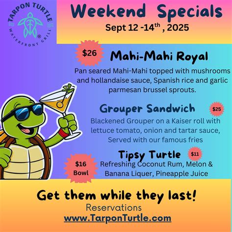 So there you have it, guys! We’ve explored the enticing world of Tarpon Turtle daily specials and what makes them such a fantastic reason to visit. From the creative culinary offerings that showcase fresh, seasonal ingredients to the incredible value they provide, these specials are designed to delight your taste buds and your wallet. Remember, checking their social media, arriving early, and chatting with your server are your keys to unlocking the best deals and most sought-after dishes. But more than just the food, Tarpon Turtle offers a complete dining experience – a welcoming atmosphere, friendly service, and the perfect backdrop for making memories. Whether you’re a regular looking for your next favorite dish or a first-timer eager to see what all the fuss is about, the daily specials are your perfect entry point. They represent the heart of what Tarpon Turtle is all about: great food, good times, and excellent value . Don’t miss out on the chance to discover your next culinary obsession. Head down to Tarpon Turtle, ask about their specials, and prepare for a meal that’s both exciting and satisfying. Your next delicious discovery is just a plate away! Happy eating!