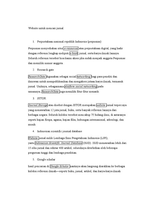Salah satu tempat paling populer dan wajib banget kalian datengin adalah Google Scholar . Siapa sih yang nggak kenal Google Scholar? Ini tuh kayak perpustakaan raksasa yang isinya nggak cuma artikel jurnal, tapi juga buku, tesis, abstrak, dan dokumen akademis lainnya dari berbagai disiplin ilmu. Kelebihannya apa? Gratis! Gampang diakses! Dan cakupannya luas banget. Kalian tinggal ketik kata kunci yang relevan, misalnya " pengembangan model pembelajaran " atau " dampak media sosial terhadap remaja ", terus Google Scholar bakal nyajiin deretan jurnal yang nyambung sama topik kalian. Serunya lagi, di Google Scholar kalian bisa lihat berapa banyak orang yang udah mengutip jurnal tersebut ( cited by ), jadi kalian bisa sekilas ngukur seberapa berpengaruh jurnal itu. Tapi inget ya, guys, nggak semua yang ada di Google Scholar itu langsung bisa diakses gratis. Kadang kalian bakal diarahin ke website publisher-nya yang minta bayar. Tapi tenang, seringkali ada juga link ke versi PDF yang bisa diunduh gratis, biasanya dari repositori universitas atau website pribadi penulisnya. Makanya, jangan malas buat klik-klik link yang tersedia!