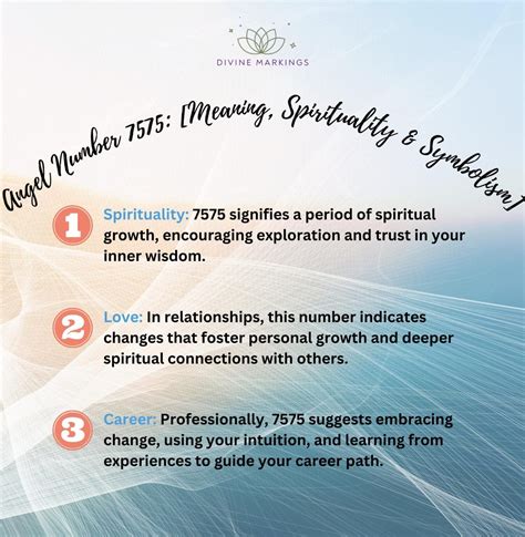 When you repeatedly see the number 7575 , many believe it’s a sign from your guardian angels or the spiritual realm. As an angel number , 7575 carries a specific divine message tailored to your current life situation. Angels often use numbers to communicate guidance, encouragement, and confirmation. The core message of angel number 7575 revolves around embracing significant life changes with divine guidance and spiritual insight . Your angels are communicating that you are on the right path, especially concerning personal growth and spiritual development. They are encouraging you to trust the journey, even if it involves uncertainty or challenges. The repetition of the 7 suggests that your angels are highlighting your spiritual connection and your innate wisdom. They want you to know that you have the inner resources and intuition to navigate any situation. This is a time to deepen your spiritual practice, to listen to your inner voice, and to trust the guidance you receive from the divine.