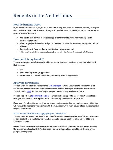 • Belastingdienst (Tax Authorities): The tax authorities are responsible for administering healthcare benefits and housing benefits. Their website provides information on eligibility criteria, application procedures, and online tools for calculating your entitlement.